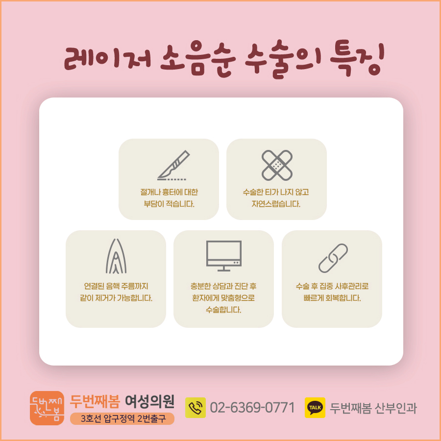 많은 병원에서 소음순 수술을 진행하고 있는데 중요한 부위에 진행되는 수술인 만큼, 경력과 경험이 많은 산부인과 전문의에게 수술을 받는 것이 부작용을 줄이며 더욱 만족스러운 결과를 얻을 수 있습니다.