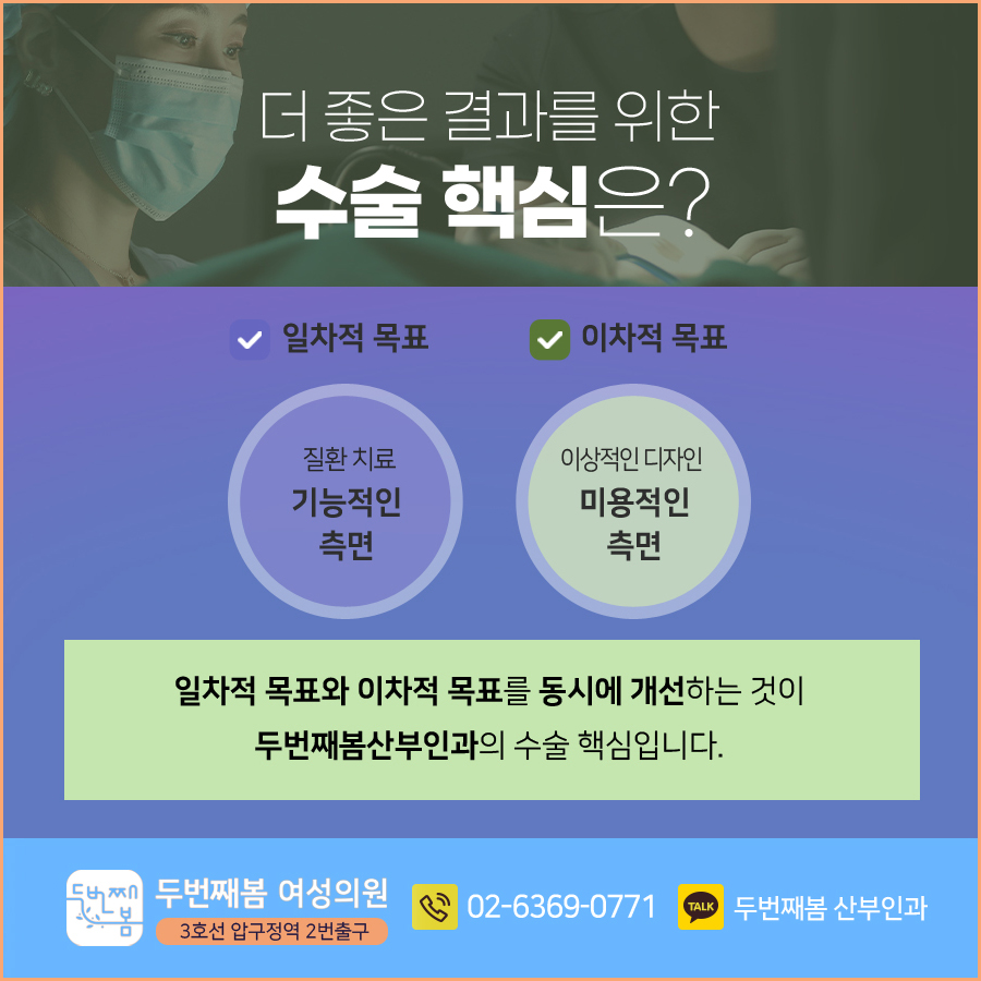 다년간 임상경험과 실력을 겸비한 의료진이 상주하고 있는 강남 압구정 두번째봄은 기능상의 문제는 물론 미용상의 방향까지 고려하여 관리계획을 세워 진행하고 있으며 해부학적인 실력과 지식을 갖춘 의료진 통해 안정적으로 관리받을 수 있도록 충분한 상담을 먼저 도와드리고 있습니다.